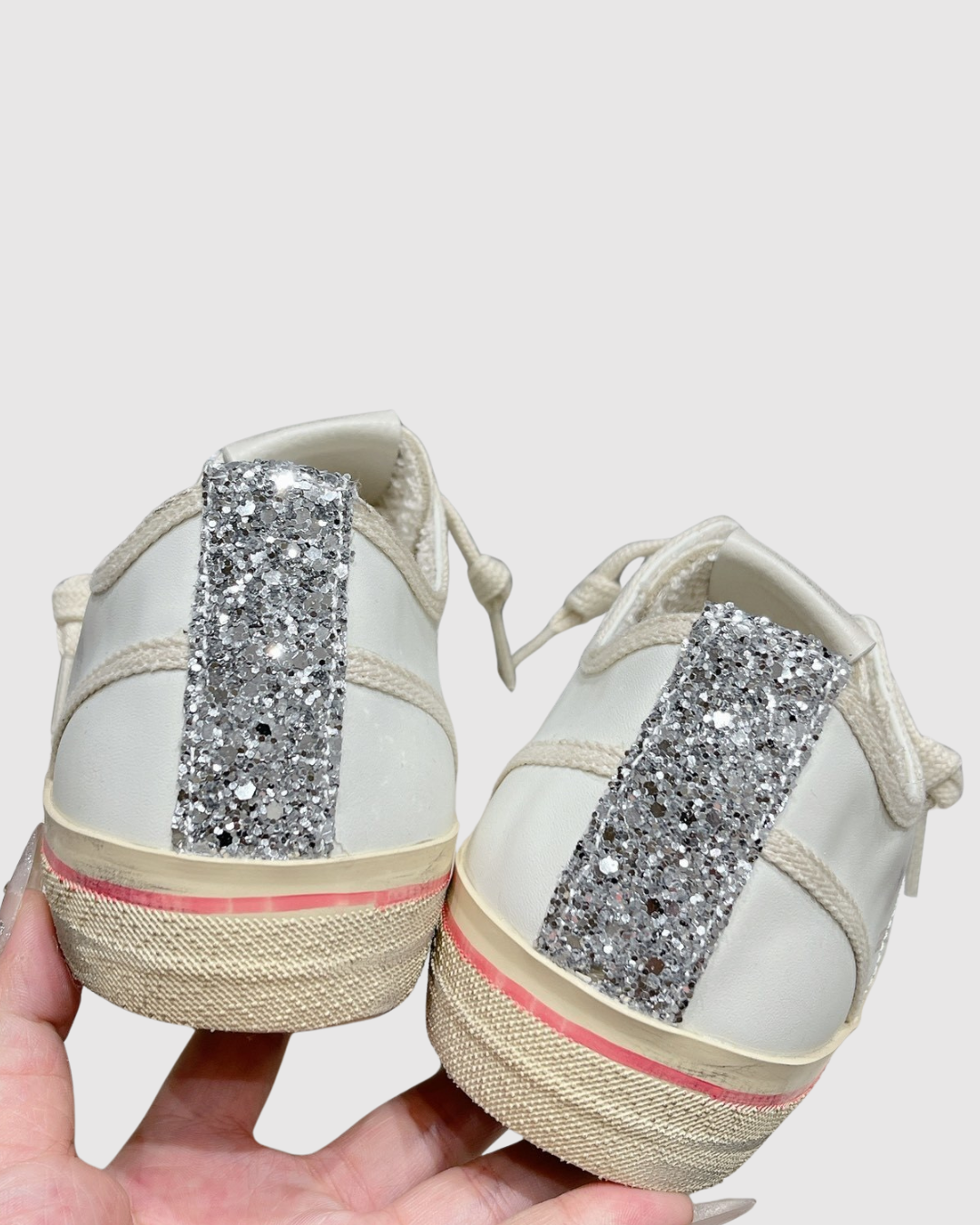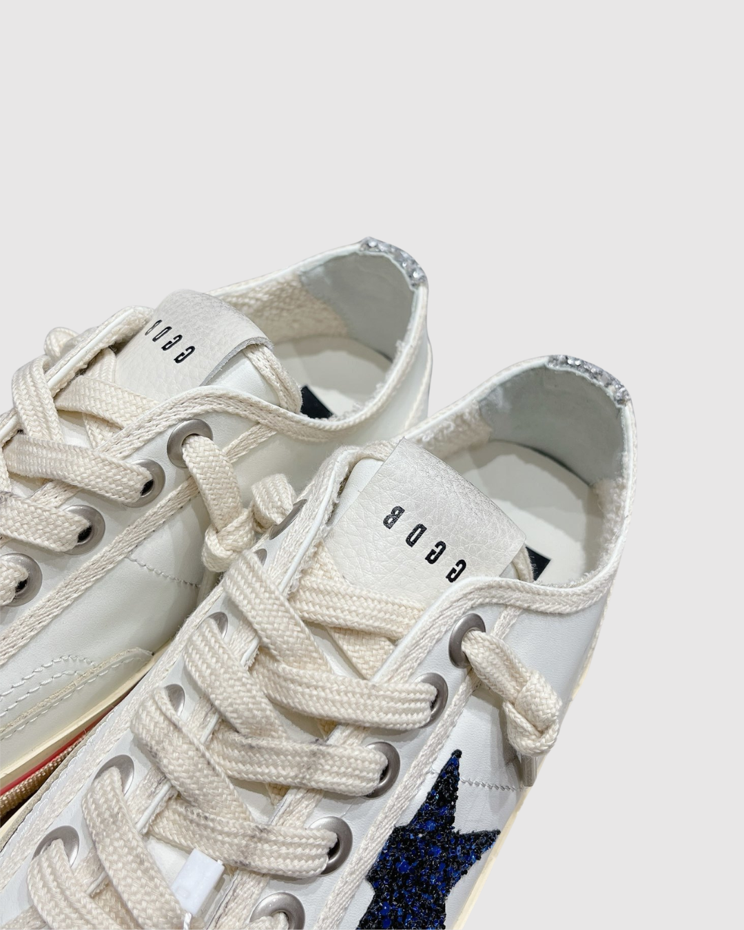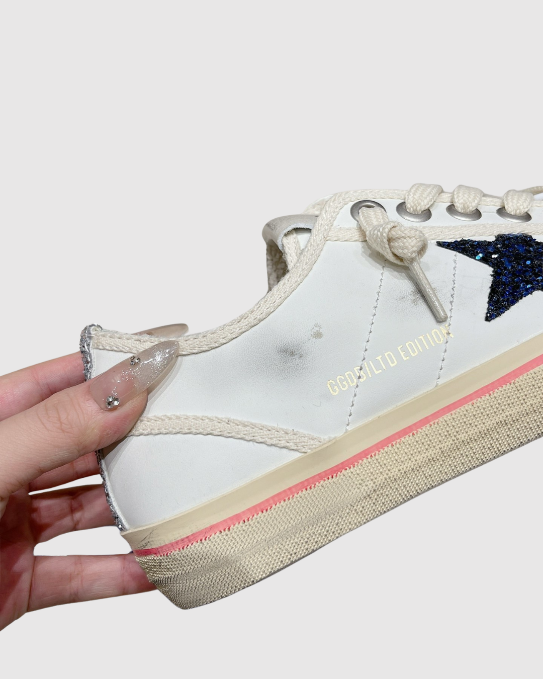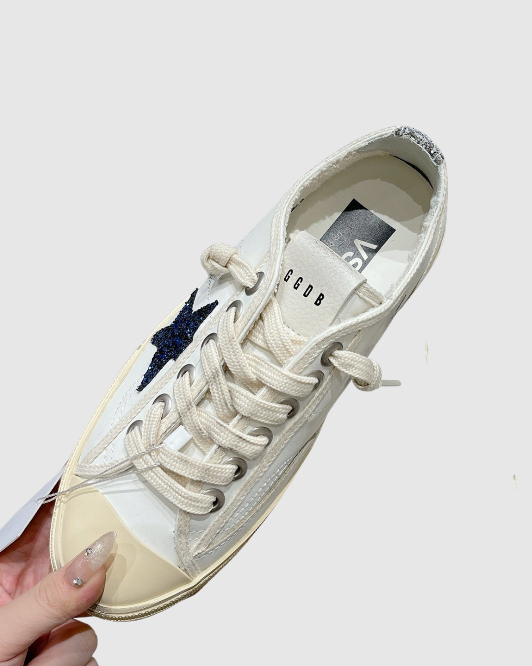 - Дизайн: Белая кожаная основа с контрастной темно-синей (или черной) звездой из глиттера (блесток) на боковой панели.