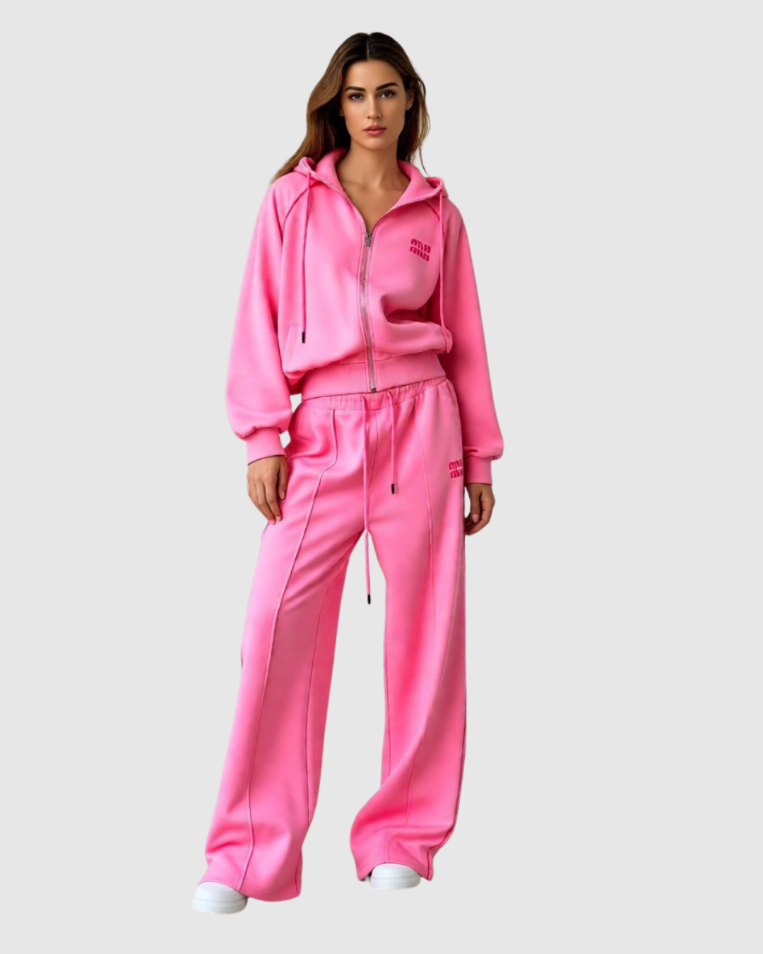 - Брюки: Широкие спортивные штаны (wide-leg) в тон худи. Брюки имеют эластичный пояс со шнурком для регулировки посадки и вертикальные декоративные швы (защипы) вдоль штанин.