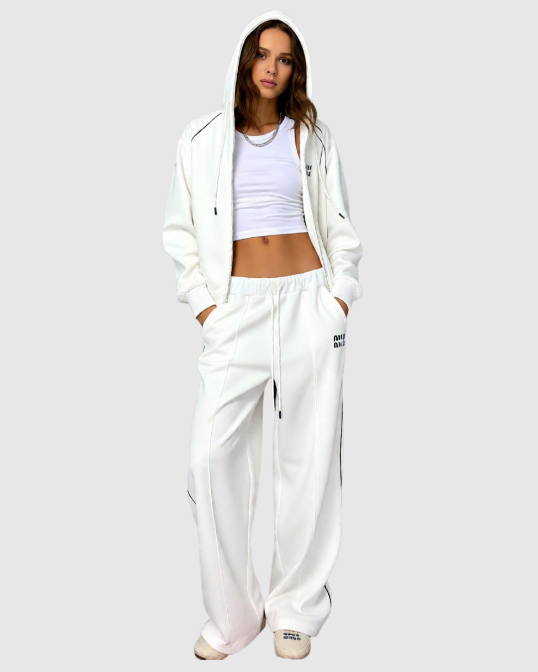 • Брюки: Широкие спортивные штаны (wide-leg) в тон худи. Брюки имеют эластичный пояс со шнурком для регулировки посадки и вертикальные декоративные швы (защипы) вдоль штанин.