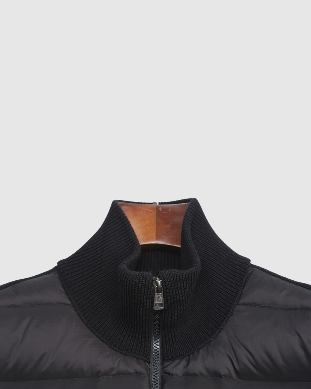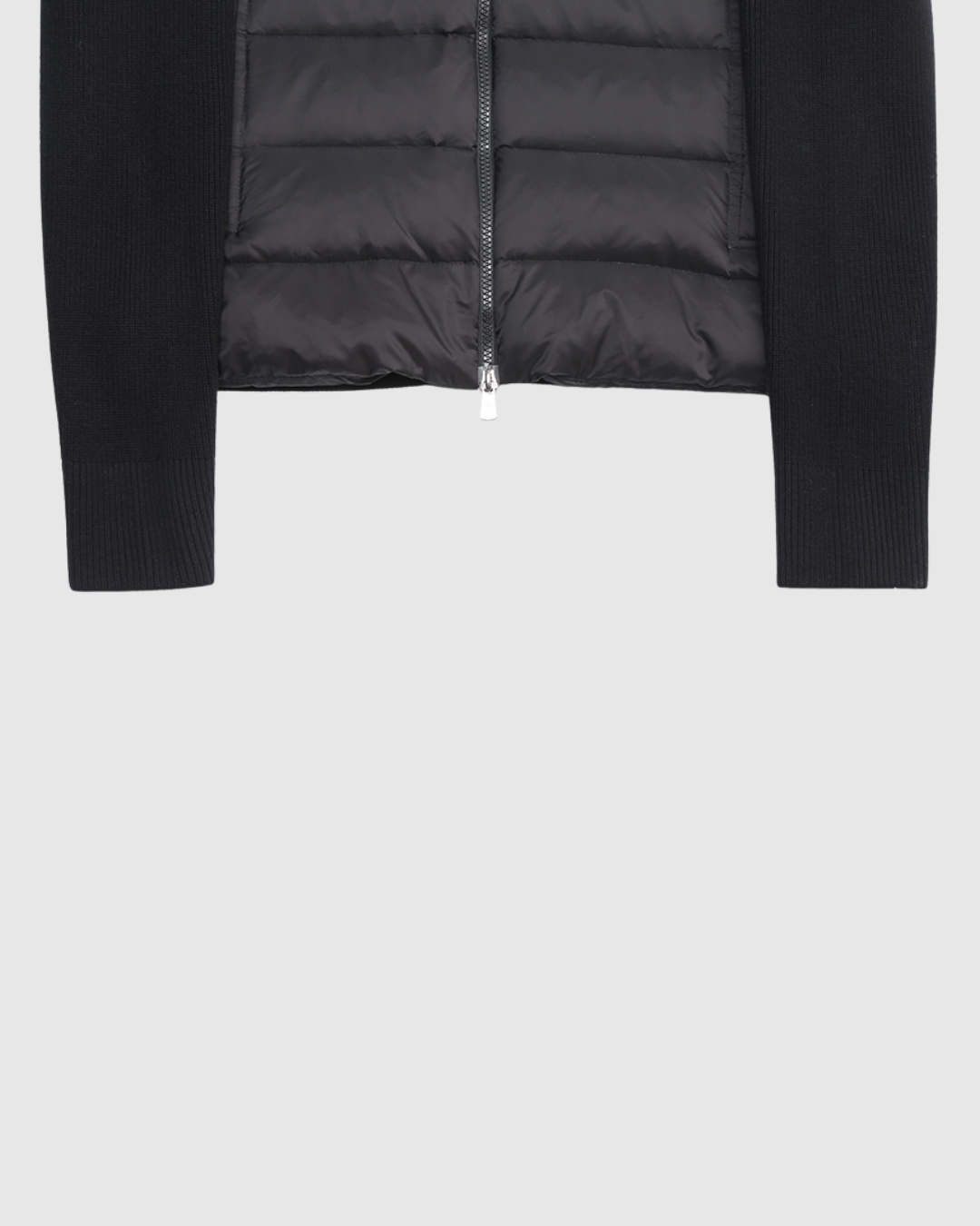 - Конструкция: Передняя часть изделия выполнена из стеганого нейлона с пуховым наполнением, что обеспечивает тепло, характерное для пуховика. Рукава, спинка и воротник изготовлены из мягкого трикотажа, часто из смеси шерсти и кашемира.